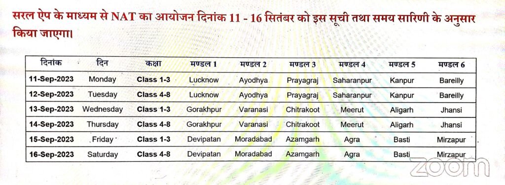 वर्तमान सत्र 2023-24 के प्रारम्भ में राज्य सरकार द्वारा शिक्षक संकुल के विद्यालय और ARP द्वारा गोद लिए विद्यालयों को दिसंबर 23 तक निपुण बनाने का लक्ष्य निर्धारित किया गया है | इस सत्र में तीन बार निपुण असेसमेंट टेस्ट (NAT EXAM) आयोजित किये जायेंगे | प्रदेश के सभी मंडलों में 11 सितम्बर 23 से 16 सितम्बर 23 के मध्य प्रथम नैट परीक्षा कराई जायेगी |